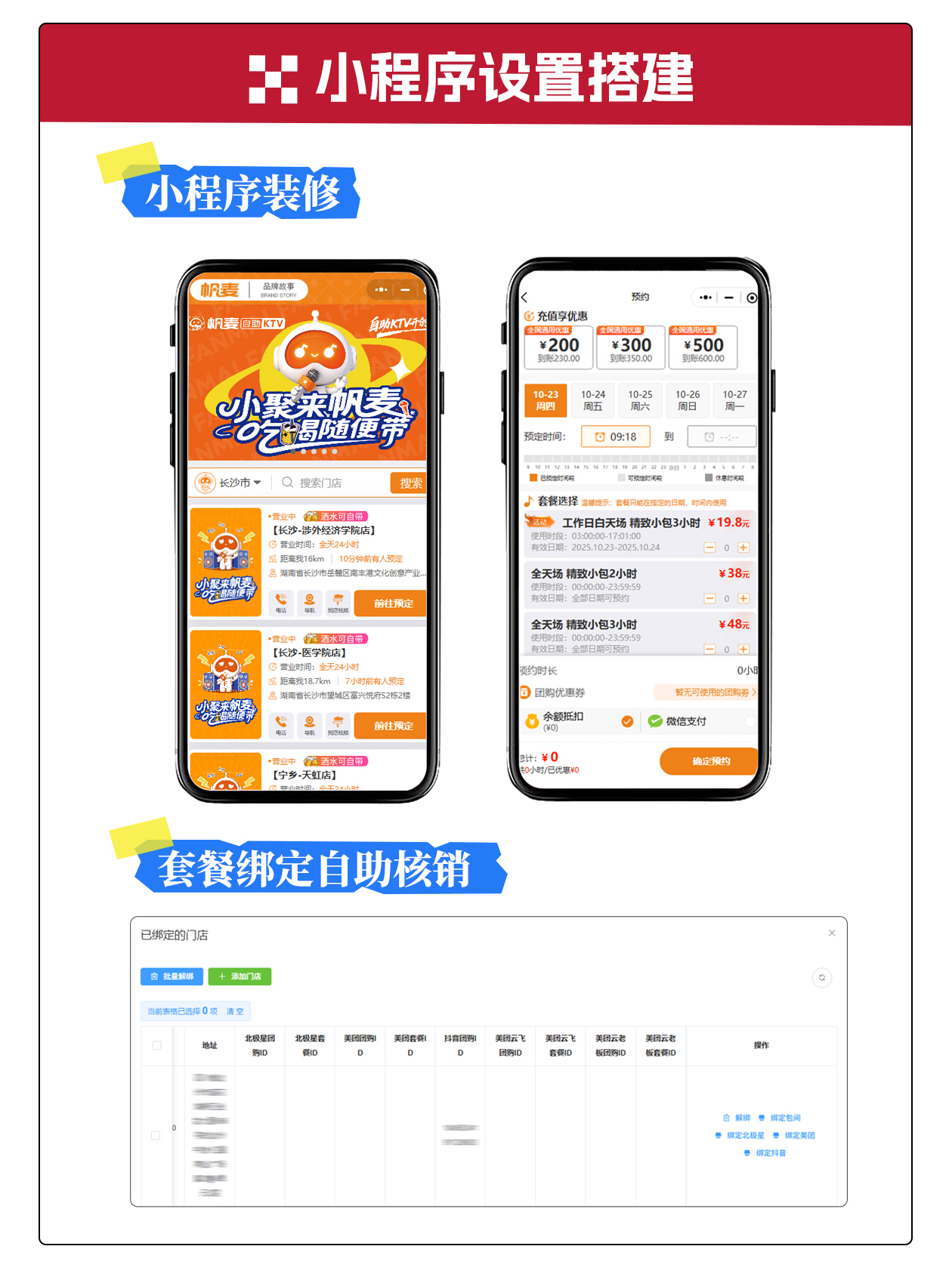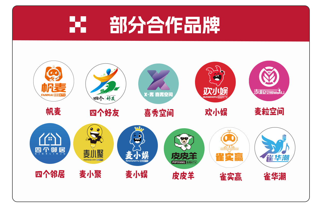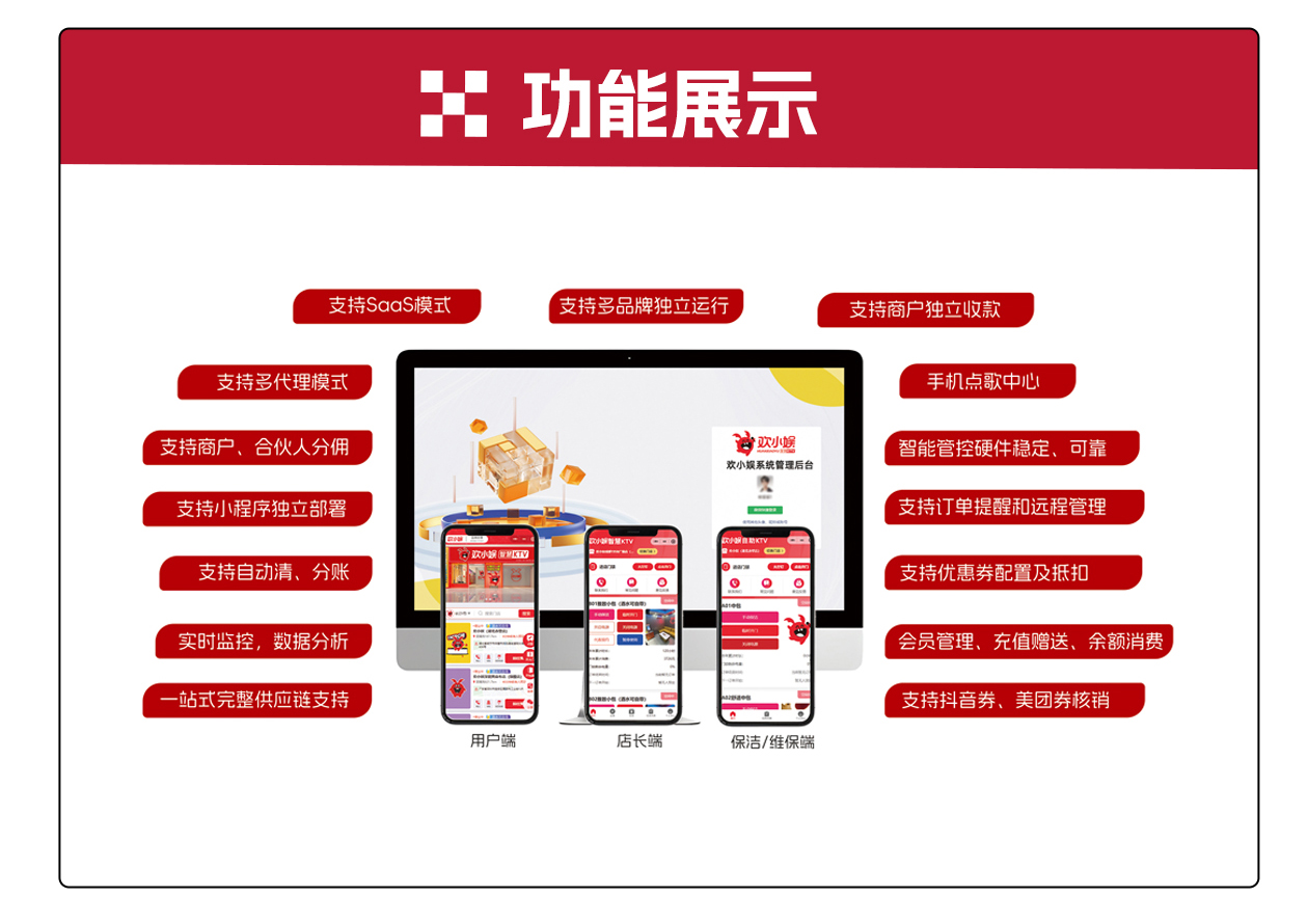 硬件资源整合供应:智能门锁、监控设备、包厢智控系统、专业点歌机、音响、氛围灯光、沙发茶几、自助售卖柜等,均提供优质供应商资源,且所有硬件可与系统无缝打通,避免兼容问题,并都会进行测试;