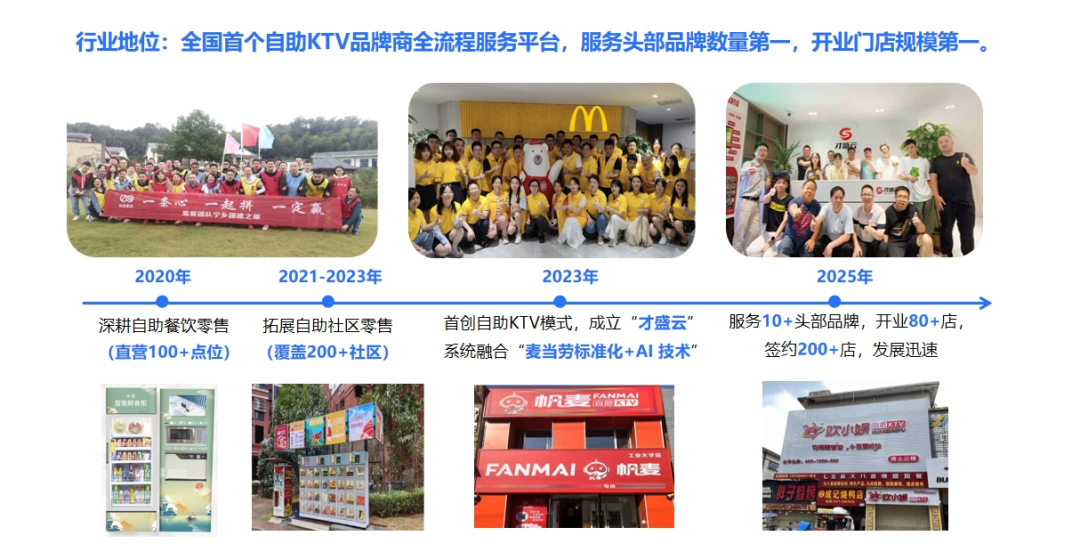 才盛云:全国首个自助KTV品牌系统服务平台,推出行业首套SaaS化系统解决方案,实现门店全流程自动化运营。目前已服务200+门店,覆盖20+头部品牌,成为自助KTV行业数字化基础设施的核心提供者。